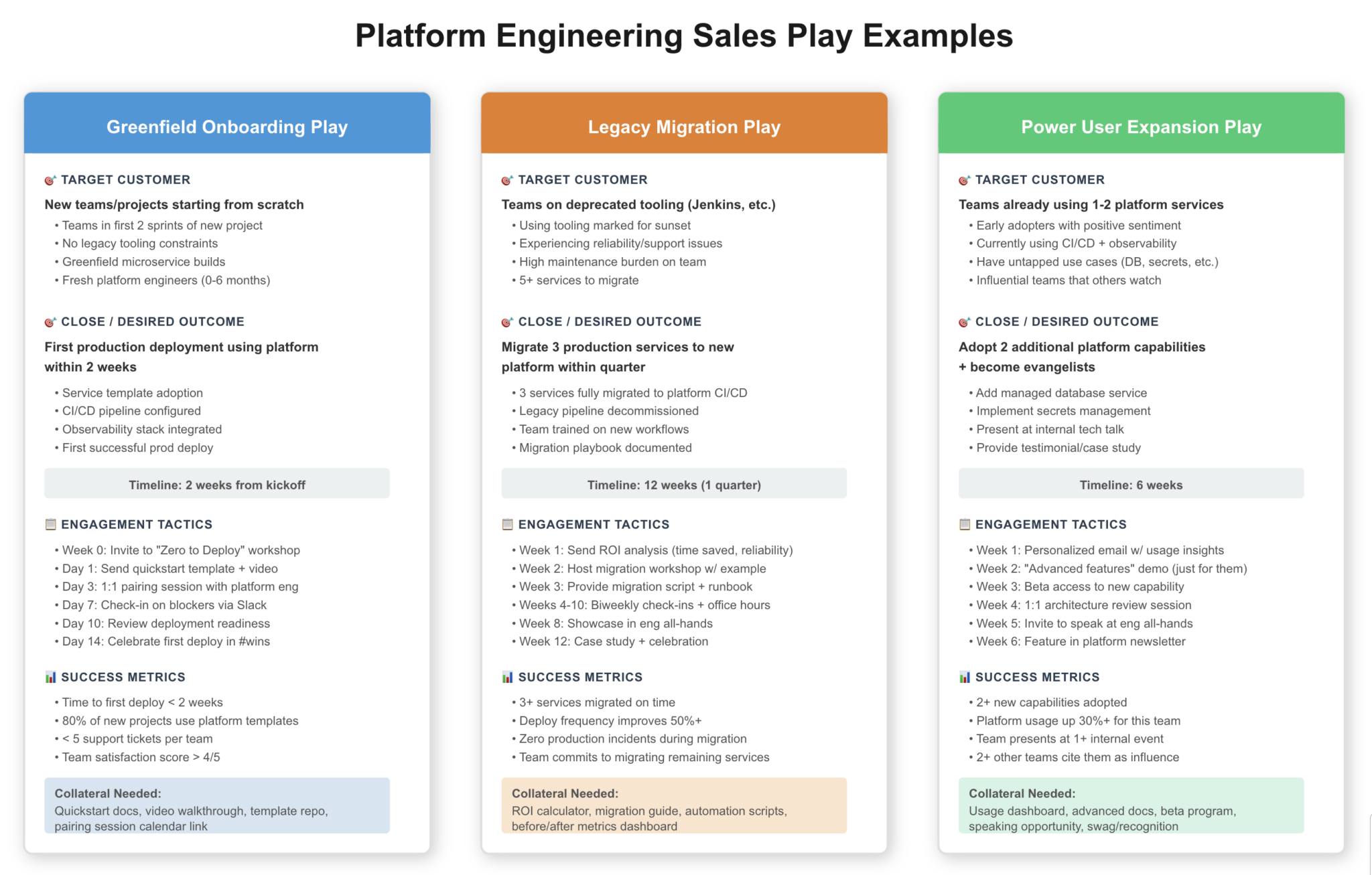 If a process is leveling up a spreadsheet to leadership showing all the teams that haven’t migrated from legacy infrastructure… and hoping each customer convinces themselves? That’s not a sales play. That’s madness dressed up as cost savings and begging from engineering managers to influence with 0 incentives for your customers to do anything against their own goals and no shepherding of the collateral required to close the play via channels. Channels in the platform engineering world would be all hands or wider newsletters that show that their play is important as opposed to externally facing outbound communication such as social media. The difference between an OKR and this is it is a much tighter closing pattern and with anything tight you really need agreement up front for the windows that you are aiming for as well as commitment to the window from everyone.